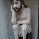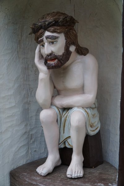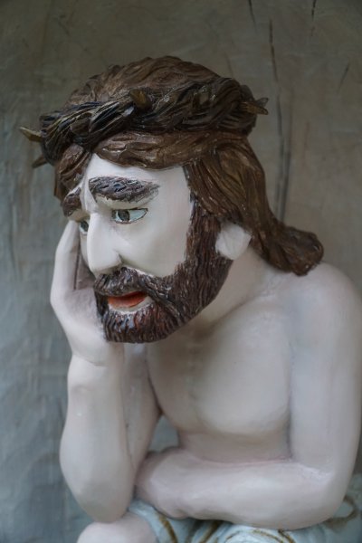 Przedstawia moment na Golgocie, tuż przed ukrzyżowaniem, choć figurę tę można także interpretować jako symboliczne streszczenie Męki Pańskiej. Ukazuje rozmyślającą postać Jezusa Chrystusa w pozycji siedzącej, z głową opartą na dłoni, jakby gdzieś z podwyższenia kłopotał się ludzkimi losami. Chrystus jest obnażony, z fałdzistym perizonium osłaniającym biodra i koroną cierniową na głowie, jeszcze bez ran na rękach, nogach i boku. .Jezus frasobliwy od wieków w sposób szczególny spotyka się z wielkim kultem na południu Polski o czym najlepiej świadczy ilość przydrożnych kapliczek z jego wizerunkiem ozdabiających nasz region.