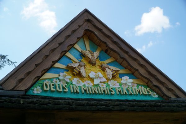 Warto zwrócić uwagę na inskrypcję w szczycie dachu kapliczki, która jest swoistą dewizą pszczelarzy: „Deus in minimis maksimus” – Bóg jest największy w rzeczach najmniejszych, wyrażającą szczególny status pszczoły jako boskiego stworzenia.