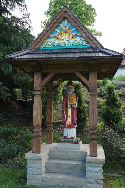 Kapliczka dla świętego nawiązująca swoim kształtem do typowych dla naszego regionu form otwartych kapliczek zwieńczonych dwuspadowym dachem wspartym na czterech słupach z zastrzałami wykonana została przez naszego „mistrza Kazimierza” – Kazimierza Stacha – cieślę, stolarza, kamieniarza, murarza, a ostatnio jak się okazało przy budowie suszarni również tego który potrafi nawet poszyć dach słomianą strzechą. Jednym słowem, bez Niego ten skansen nie miałby większych perspektyw rozwoju.